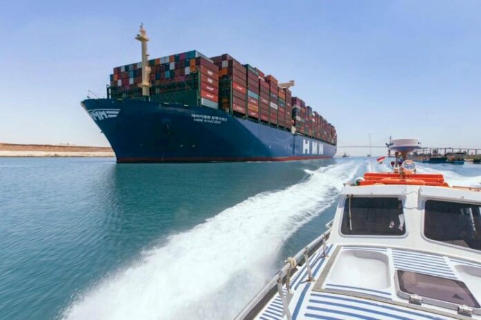 And as per protocol in the Suez Canal Authority on receiving mega vessels transiting for the first time, Admiral Osama Rabie delegated SCA Distinguished Senior Pilot, Capt. Hisham Fawzy, and First Senior Pilot, Capt. Medhat El-Naggar, to board the vessel and welcome its crew as well as present the Shipmaster, Capt. Jon Kiun, with a commemorative gift.